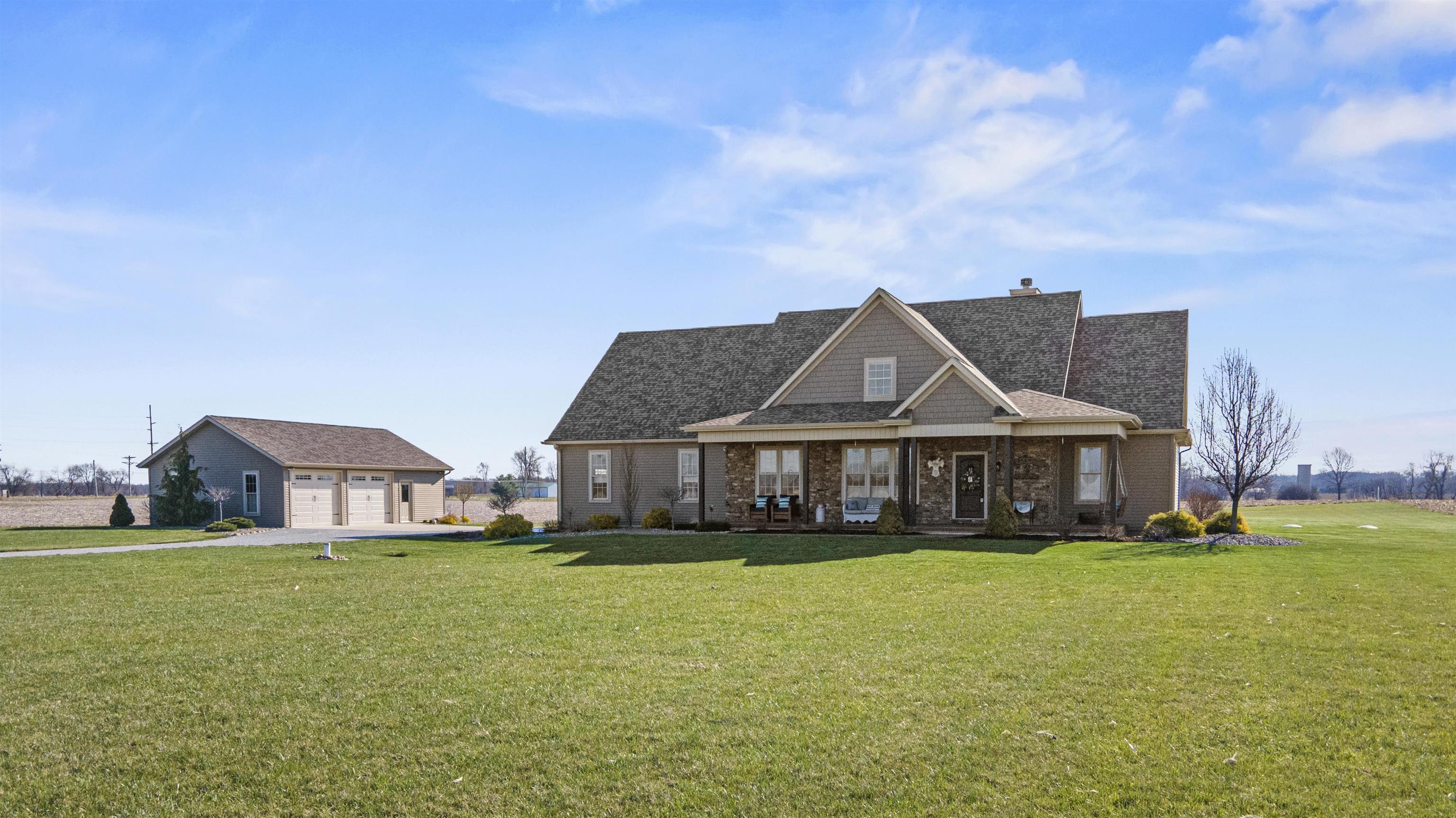 No detail was overlooked in this 4 bedroom, 3 bathroom home built in 2017 by VanGordon. As you approach the front door, you will be greeted by a stamped concrete covered porch with cedar posts and natural stone. Walk in the front door to the inviting foyer. The office space is located on the main level and provides ample natural light and a view of the outdoors. The spacious great room features a wood burning fireplace with a natural stone surround. As you move into the kitchen, you will be wowed by the stunning granite countertops, custom knotty hickory cabinets made by Schmucker, travertine backsplash and a pot filler. The master ensuite is located on the main level. The master bathroom boasts a travertine walk-in shower with dual shower heads, dual copper sinks with granite countertops and a spacious walk -in closet. The main level laundry offers cabinets for additional storage and a leathered granite countertop perfect for folding. A second bedroom and additional full bath with leathered granite countertops are also located on the main level. Upstairs you will find two bedrooms and another full bathroom with slate flooring and dual sinks with leathered granite countertops. Whether used for storage or finished for a secondary living space, the walk-in attic on the second level has so many possibilities. The two car attached garage has an epoxy floor and houses the mechanicals. Travel outside to the 26' x 36' outbuilding which can be used for storage or would be a great man-cave or shop. Situated on 2 acres, this home offers a stamped concrete back porch overlooking the large yard with peaceful views.