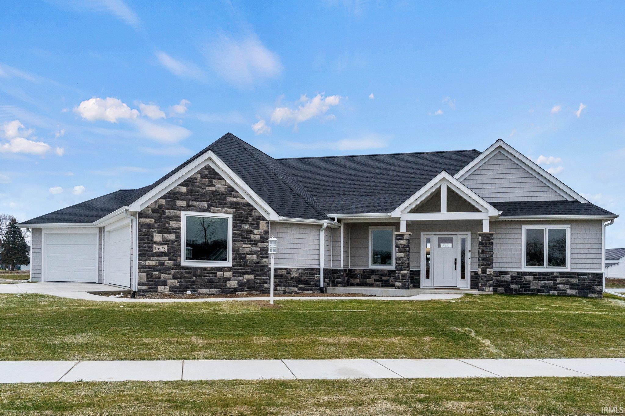 Open this Sunday 1/14/24 from 2pm - 4pm . Located in the coveted community of Cascata Estates, Bob Buescher Homes presents a hand crafted single story home on a slab. This open concept, split bedroom design contains 2,197 sq ft of livable space, 3 bedrooms, an office/den, a large covered porch, and an oversized 3 car garage with 1,012 sq ft of space. The foyer displays a wood beamed detail, while the great room, kitchen, and dining area are enhanced by an expansive cathedral ceiling; this feature will amplify the space & details of the main living area; including the elegant fireplace with shiplap accents. Our custom designed kitchen provides plenty of storage space; with hand crafted cabinets by Zehr, Quartz tops, a 5X8 island, a walk-in pantry, and a full kitchen appliance package which includes: gas range, dishwasher, microwave, range vent hood, and refrigerator. Tucked away for privacy is the primary bedroom suite with an adjoining master bathroom. The master bathroom exhibits a double vanity with Quartz top, linen closet, a tile-walk-in shower with recessed entry, private water room, and a large walk-in closet. Bedrooms 2 & 3 are in their own wing opposite the primary bedroom, as this is a split bedroom plan and both rooms are generous in size. The office is positioned just off the garage, and tucked away for privacy. As the viewer enters the back yard they will appreciate the use of the covered porch & patio, along with the well thought out positioning of the home, which captures the beautiful water views. Cascata Estates is close to walking trails, I69, shopping, and restaurants. All model homes fall under our 1 year express warranty guidelines and orientation will be offered to the new owners prior to closing. Please note: Kitchen appliances fall under their one year manufacturing warranty, not the 1 year express warranty.